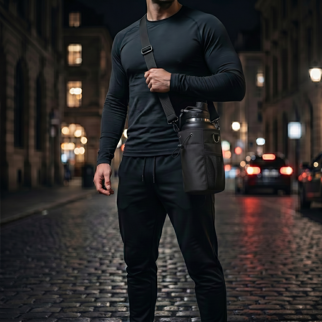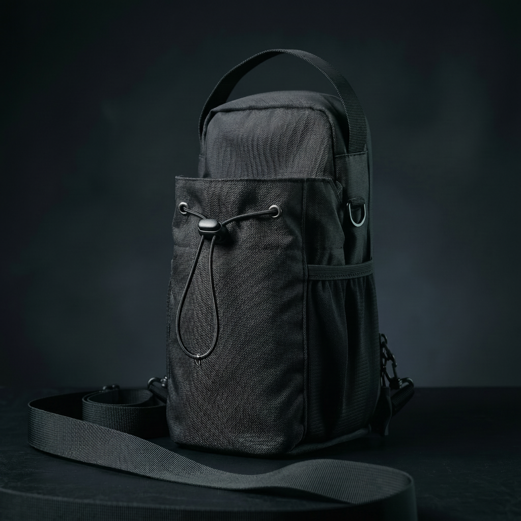 Tissu nylon noir haute densité, coutures renforcées, fermetures éclair robustes. Dimensions : 27,5 cm x 16 cm x 13 cm. Compatible avec les gourdes jusqu'à 1,5L. Bandoulière ajustable incluse.